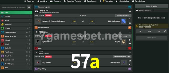 O 57a oferece uma grande seleção de opções de apostas em e-sports com probabilidades competitivas